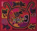 중남미 산브라스 섬의 구나족의 전통 퀼트입니다. 천을 여러 장 겹쳐, 위에서 아래로 천을 감치는 수법인 리버스 아플리케 기법이 사용되어 사람이나 다람쥐, 거북이, 당나귀 등의 동물을 표현합니다. 대담한 원색의 사용으로 느낌이 강렬하며 상징적이고 기하학적인 문양을 갖고 있습니다.